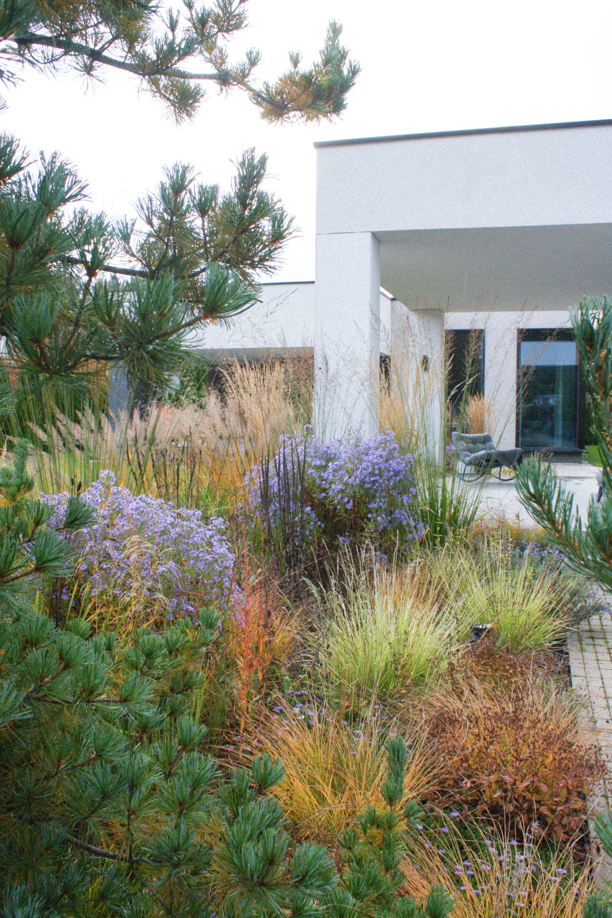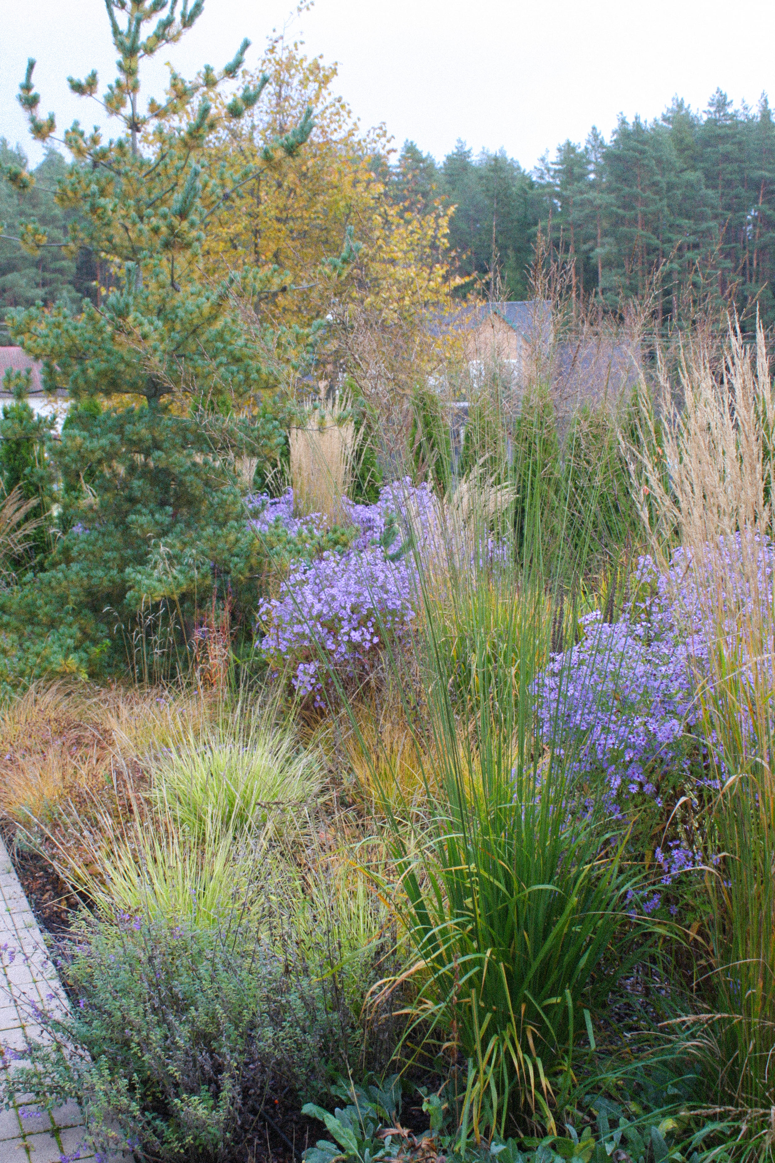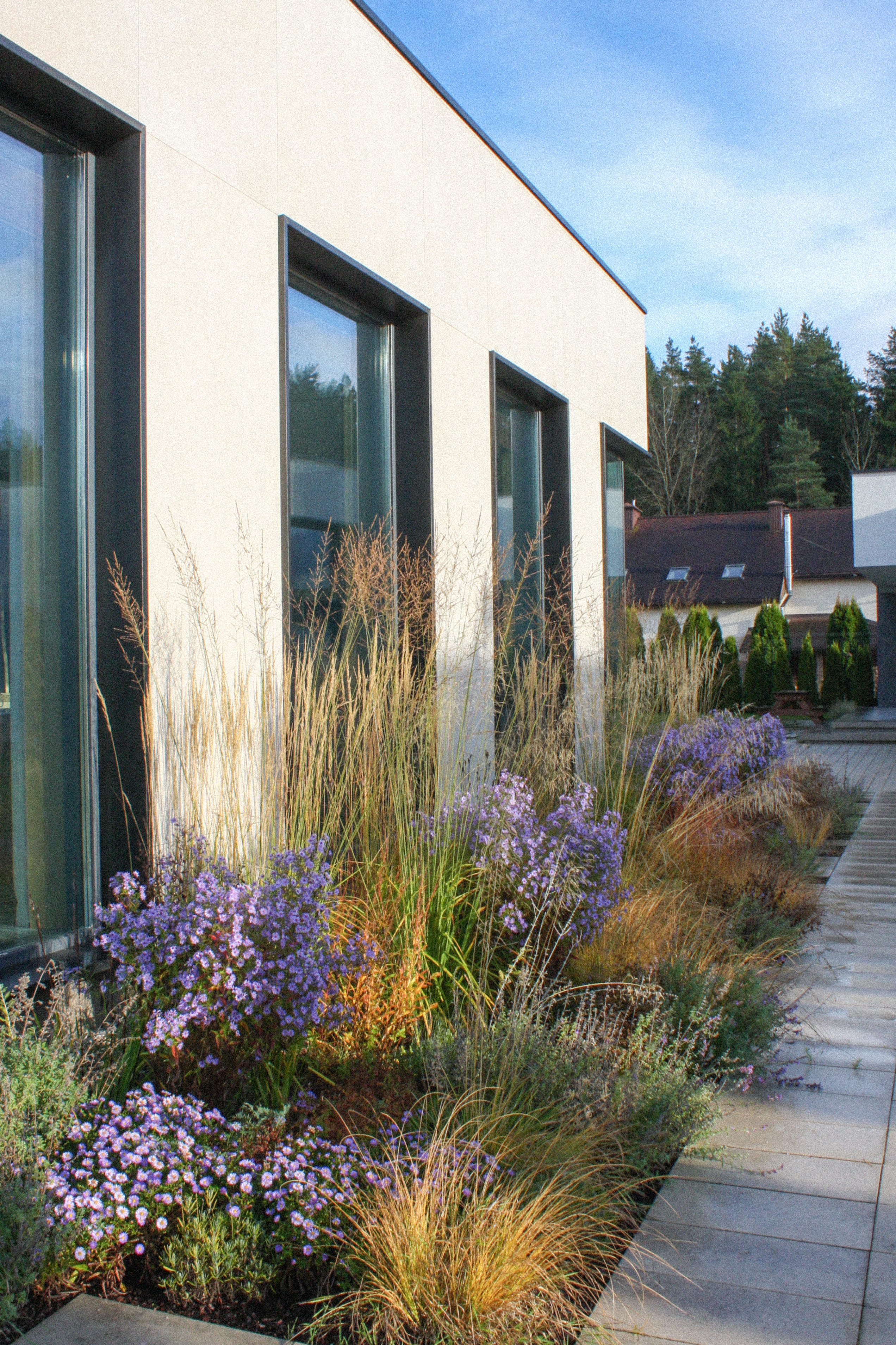Газон в таких планировках идет вторым слоем и не заметен сквозь растения. Функция и эстетика в одном флаконе.